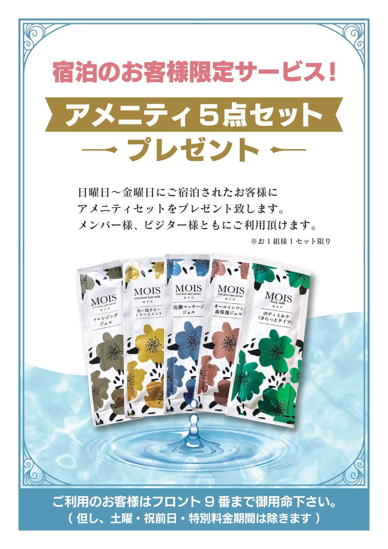 宿泊のお客様限定サービス! 宿泊のお客様限定サービス! アメニティ5点セットプレゼント 日曜日~金曜日にご宿泊されたお客様にアメニティセットをプレゼント致します。 メンバー様、ビジター様ともにご利用頂けます。 ご利用のお客様はフロント9番まで御用命下さい。 ↑画像クリックで拡大表示されます。